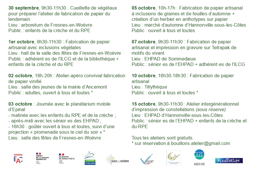 Recueil sera mené avec les très jeunes enfants, les personnes âgées, les familles et publics des bibliothèques, des artisan·es et des expert·es du vivant. A l’issue du projet nous enterrerons le coffret-recueil dans un moment festif et porteur d’un message pour les générations futures : faire mémoire pour mieux prendre soin.
