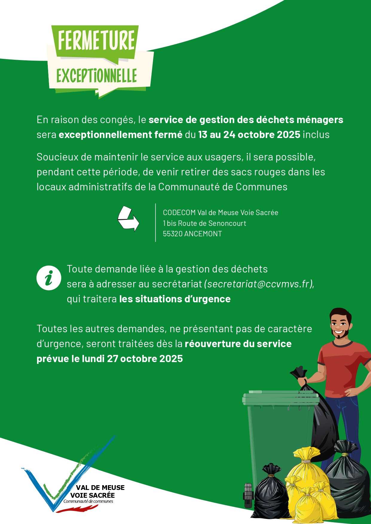 Toute demande liée à la gestion des déchets sera à adresser au secrétariat (secretariat@ccvmvs.fr), qui traitera les situations d'urgence. Toutes les autres demandes, ne présentant pas de caractère d'urgence, seront traitées dès la réouverture du service prévue le lundi 27 octobre 2025