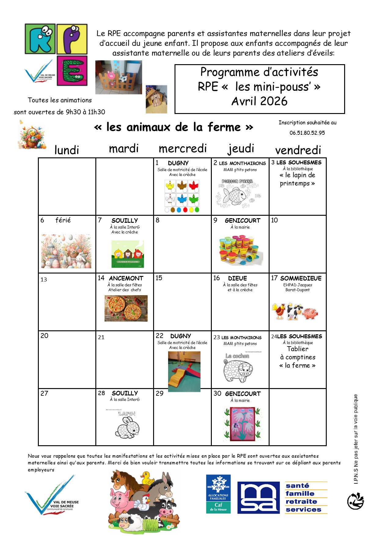 Voici le programme des animations du Relais Petite Enfance de la Codecom Val de Meuse Voie Sacrée pour le mois d'avril 2026 ouvert aux assistantes maternelles et parents employeurs du territoire