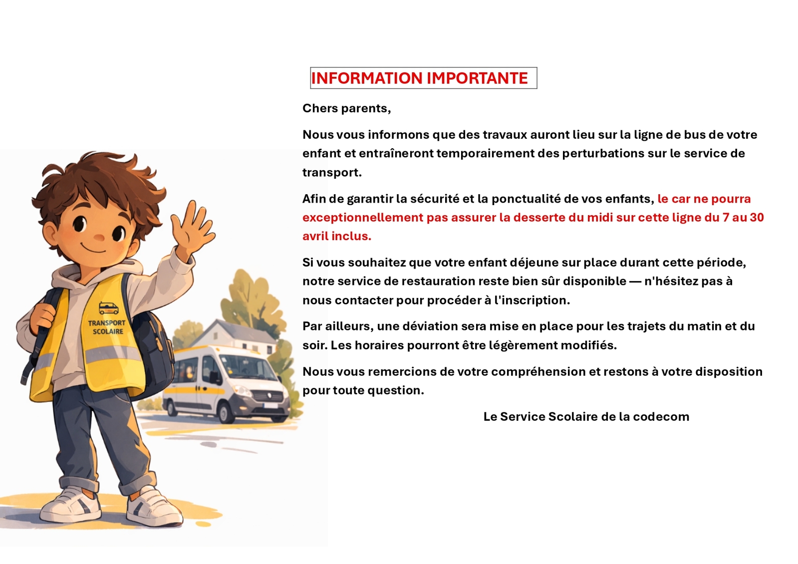Afin de garantir la sécurité et la ponctualité de vos enfants, le car ne pourra exceptionnellement pas assurer la desserte du midi sur cette ligne du 7 au 30 avril inclus.