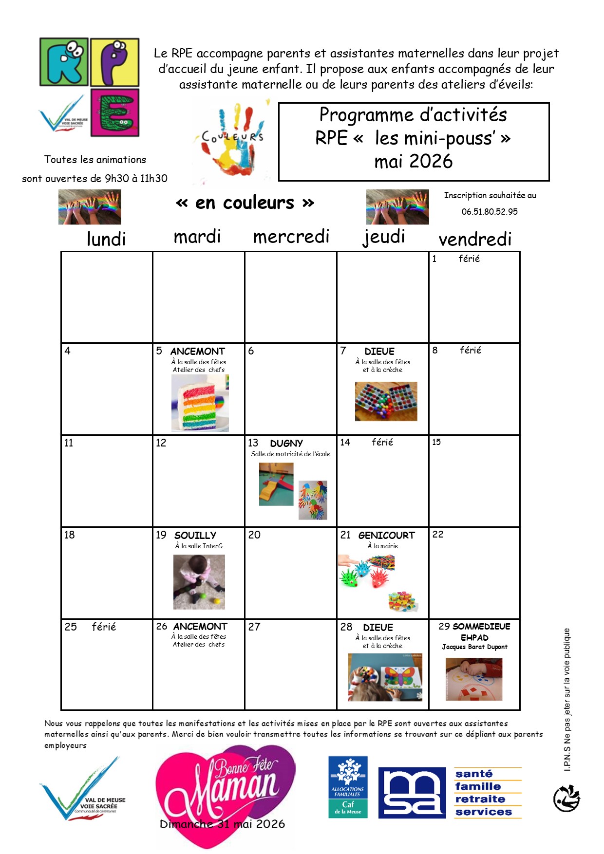 Voici le programme des animations du Relais Petite Enfance de la Codecom Val de Meuse–Voie Sacrée pour le mois de mai 2026 ouvert aux assistantes maternelles et parents employeurs du territoire.